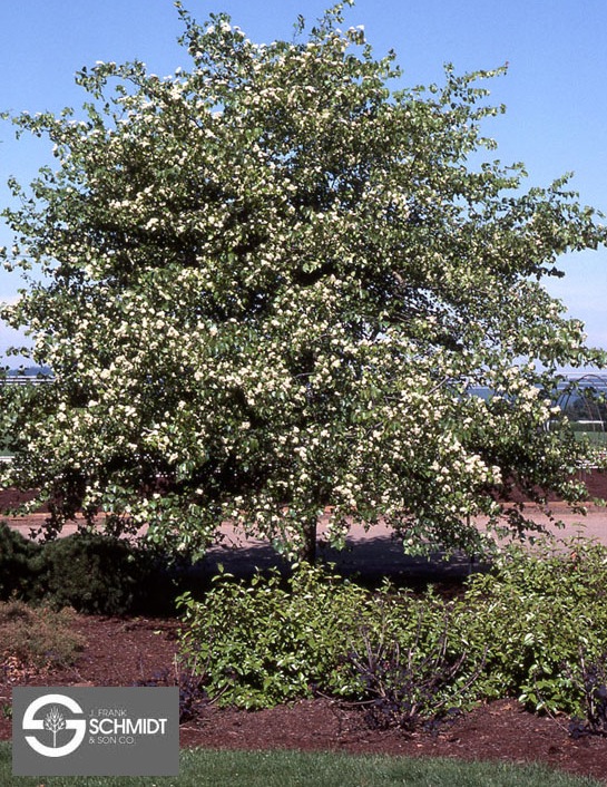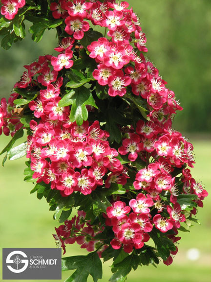 | Crataegus laevigata - The flowers are white, but most cultivars commercially available have a pink blossoms. They are 1/2 inch wide and form in corymbs. They appear in late spring. | Crataegus phaenopyrum - The flowers are white and bloom in the beginning of summer. They are very short lived, only 7-10 days. |