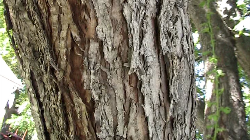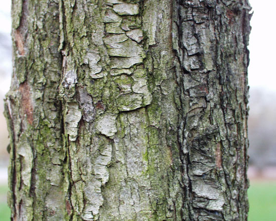 | Crataegus laevigata - The bark is gray in color and and has a rough texture that looks like it is exfoliating. | Crataegus phaenopyrum - The bark is gray-brown in color and roughly textured. |