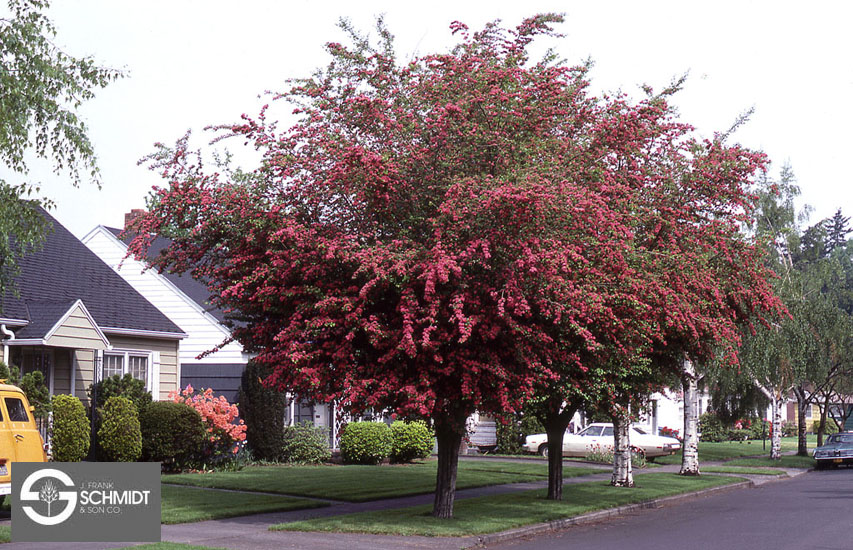 | Crataegus laevigata - The tree grows 15-20 feet high and has a dense and tangeled canopy. | Crataegus phaenopyrum - It grows 20-30 feet high and wide and has a rounded but irregular form. |