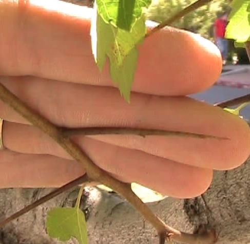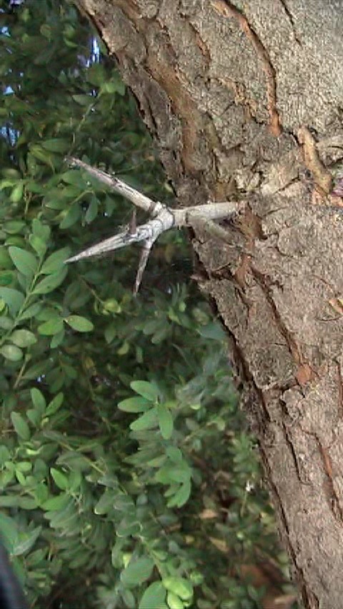 | Crataegus laevigata - The throns are located at the leaf node and on the ends of branches. They are smaller than the thorns of either Crataegus phaenopyrum or x lavallei. | Crataegus phaenopyrum - The thorns are 3 inches (or longer) and very stiff. They form in abundance throughout the canopy. |