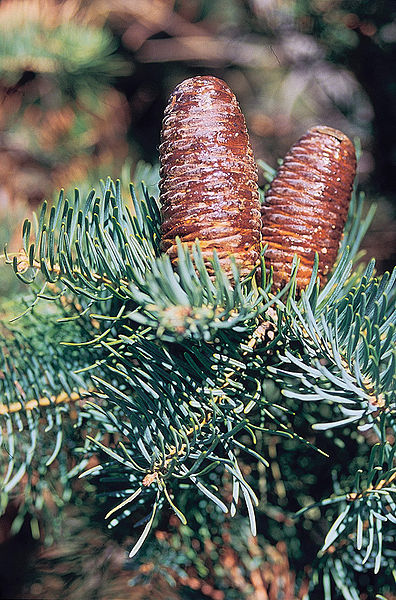 The cones are cylindrical, tapering to a bluntly rounded tip. They have layers giving them the appearance of a traditional beehive. They are light green in color before turning a purplish-brown color. They are 3-6 inches long and often exude resin.