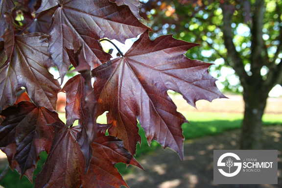 Crimson King br> Extremely popular due to its rich maroon colored leaf. It may experience some leaf scorch during the middle of summer here. It reaches 40-50 feet tall. br>