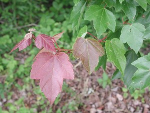 In the early spring the tree puts form somewhat showy red flowers at the buds. Up close, the flowers are not particularly attractive, but at a distance they create a fair effect on the tree. Following the flowers, 2-4 inch long green leaves emerge (new leaves may be tinged with red overtones). The leaf has three lobes, though five-lobed leaves may sometimes develop, and a doubly-serrated margin. The underside of the leaf is a silver-gray color. The petiole is 2-4 inches long and is often red. In fall the tree puts on a spectacular show as the leaves change to a very bright red color.
