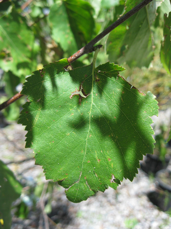 The green leaves are 1 1/2 to 3 1/2 inches long, and slightly wider in length, creating a somewhat blunted ovate shape. The margin of the leaf is doubly serrated, though close inspection of the leaf is usually required in order to notice this. In the fall the leaves turn yellow and defoliate in a short time. Somewhat-showy catkins emerge on the tree in the summer and by fall these turn a yellowish-brown.
