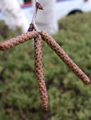 | The bark of Paper Birch is bright white peels off in thin, papery sheets. | 2-4 inch long catkins appear in clusters during summer. |