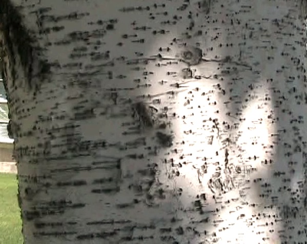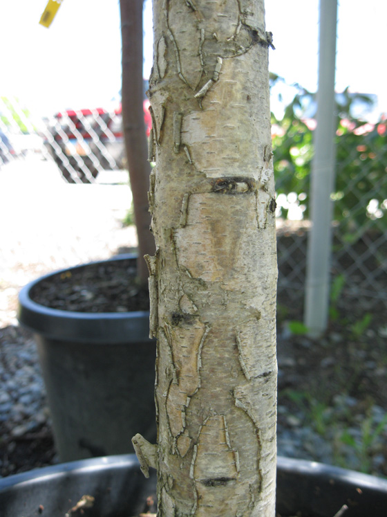 Young bark is brown, but as the tree matures it turns to a bright white. A very small amount of peeling will occur on the bark, but the main ornamental feature is the white color and the dark horizontal lenticels. As the tree matures, dark brown or black vertical fissures form on the trunk.