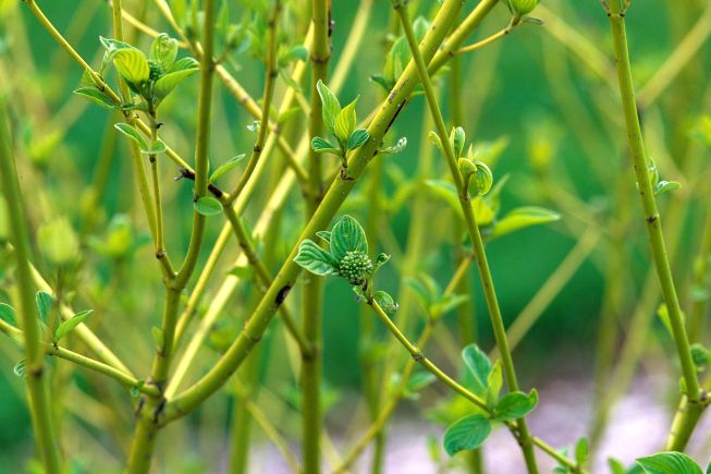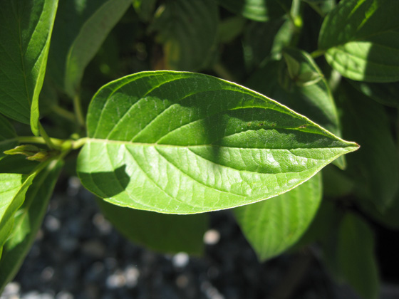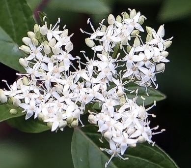 | The leaves of Cornus sericea are vibrant green, elliptic and have an arcuate vein pattern. | Small clusters of flowers appear in late spring or early summer. |