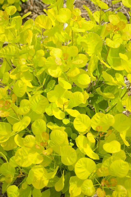 A yellow-leaved cultivar that has circular leaves and beautiful bright yellow new foliage. The young foliage is often tinged with red or green around the margin. The smoke effect is not as good.