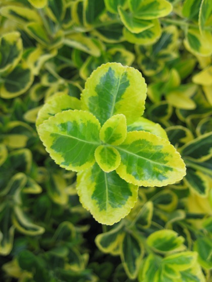 Euonymus japonicus, or Japanese Euonymus is a beautiful evergreen shrub with an attractive large glossy leaf. Unfortunately, as a zone 6 or 7, it is not hardy in our climate except in the warm microclimates. I suspect once the plant is established it may be more cold tolerant than is commonly thought. It grows 10-15 feet high and 5-7 feet wide. It has an upright rounded form that is very dense. It hedges well, but must be trimmed frequently because of its fast growth rate. It is exceptionally tolerant of many different soil conditions and will happily grow in full sun to full shade.