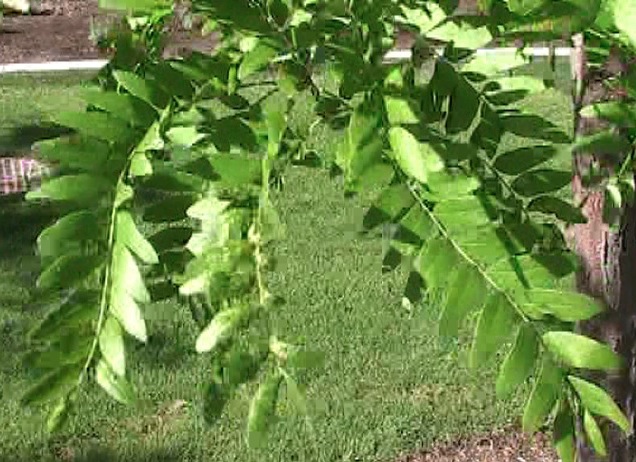 Honeylocust leafs out very late in the season, so late in fact that sometimes even I wonder whether the specimen in my yard has died each spring. The leaves are pinnately or bipinnately compound. They are typically 6-8 long, with some individual leaves being much longer, and light green in color. The small leaflets are only 1/3 to 1 1/2 inches long, and are lanceolate in shape. The fine texture of the leaves produces a light shade that permits the planting of annuals or perennials underneath it. The leaflets turn yellow in that fall and drop from the tree followed by the petiole.