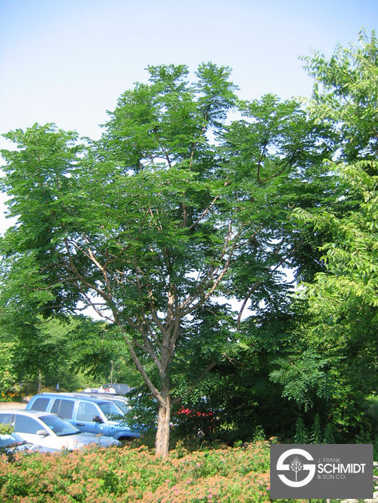 The dark bark is a ridged and furrowed, with the ridges often appearing wavy or twisting in form. Young branches quickly develop the bark pattern. The large leaves are bipinnately compound and can reach up to 3 feet in length and 2 feet in width. The leaflets are elliptic in shape They are a deep green in color and emerge late in spring. The fall color is inconsistent, but can be a rich yellow color.
