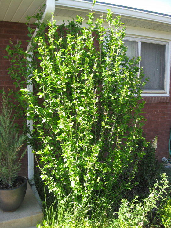 The leaf has three distinct lobes with an irregular serration on the margin of the leaf. They are a bright and vibrant green and slightly lustrous. The leaves are arranged alternately on the stem. In late summer and into fall, the shrub puts on a great blossom display, with individual flowers 2-4 inches across. The flowers have five-petals and can be white or any number of shades of purple, depending on the cultivar.