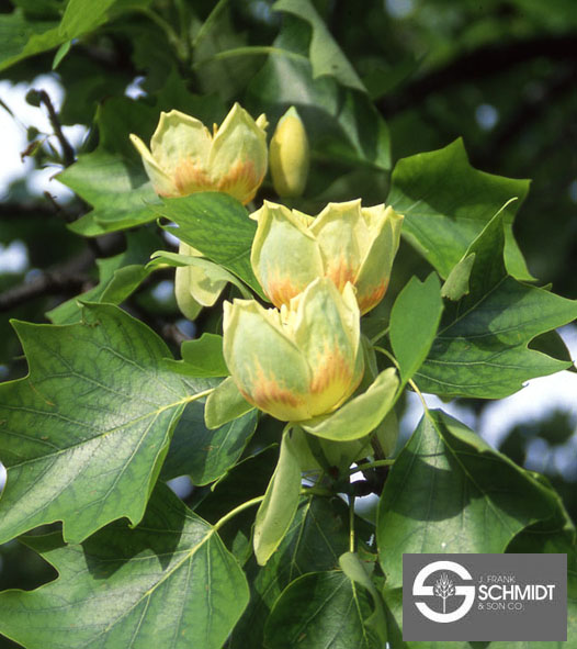 Liriodendron tulipifera, or Tuliptree, is a large shade tree, reaching 70-90 feet tall and 35-50 feet wide. It has a tall and upright form with a limited number of thick and large branches that give the tree a very strong skeletal appearance during the winter. It prefers a moist and slightly acidic soil, but will tolerate a wide range of soil and moisture conditions except for drought.