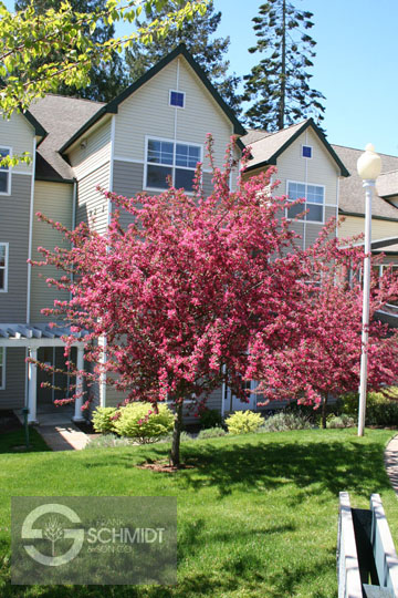 Crabapples are one of the most common species of trees used in commercial and residential landscapes because of their hardy nature and beautiful spring blossoms. Because of the vast number of different varieties of Crabapples, it is difficult to generalize about their habit and form. The most consistent features is their spring blossoms, serrated leaves, alternate branching pattern, shiny gray bark at maturity, and production of pome fruits (though several new varieties are fruitless). See the cultivar descriptions below for a more detailed description of the characteristics of each individual cultivar.