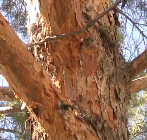 The bark exfoliates and is a prominent ornamental feature of the tree. It is reddish-brown and forms in plates and fissures near the base of the trunk. On the upper two-thirds of the trunk the younger bark is a vibrant orange color. The needles are grouped in pairs. They are a deep blue-green color and 1-3 inches long. They are quite stiff and regularly have a twist or curve to them.