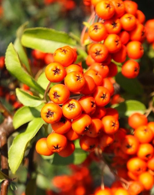 | Corymbs of small white flowers appear in the spring. Image: Wikipedia | The most showy element is the clusters of bright orange (sometimes red) berries that form in the fall. |