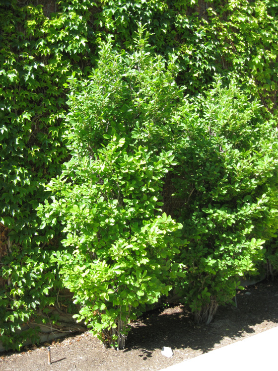 Rhamnus frangula 'Columnaris', or Tallhedge Buckthorn, is one of the best vertical accent plants available when it is well maintained. Conversely, if it is neglected and left unpruned it becomes a rather unkempt and unsightly tangle of dead wood. Regular pruning of dead wood to encourage new growth is needed to keep this plant looking its best. It grows 10-15 feet high and 5 feet wide.