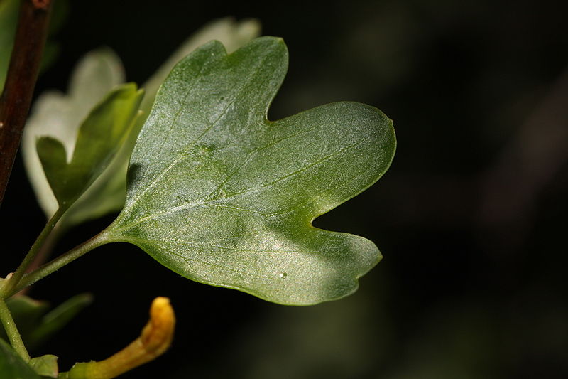 The leaf is 1/2 - 1 inch long and has three to five lobes, with the ends of the lobes having a couple large rounded teeth. It is a light to medium green color and glabrous. The leaves are arranged alternately on the stem. In the fall the foliage turns a yellow, orange or red color.