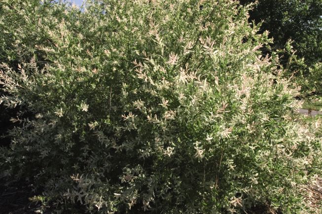 S. integra 'Hakuro Nishiki': br> New growth emerges pink, fades to white and then a dappled white and green. Performs best in part-shade. 4-5 feet high and wide. br>