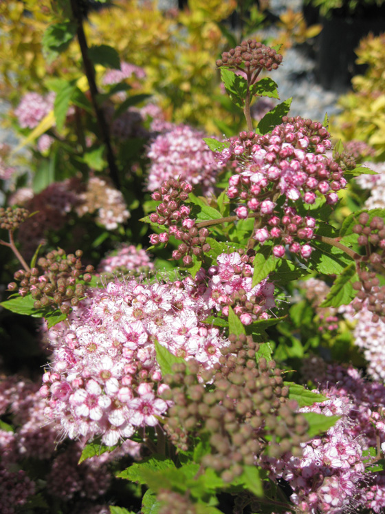 Dark green serrated leaves (1-2 inches) are arranged alternately on the stem. Large clusters of pink flower corymbs appear in the late spring. Once the blossoms are spent, the brown corymbs covering the plant are quite unsightly and should be pruned.
