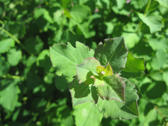The leaf is an attractive bluish-green color and oval to elliptic in shape. They are 3/4 - 2 inches long and often have an undulating or loosely lobed margin. New leaves have a distinct pink-tinged margin. The underside of the leaf is pubescent. In the early summer, small and drooping pink flowers appear in short terminal racemes. They are not ornamentally important, but are attractive when viewed closely.