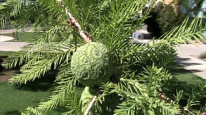 One inch globular cones form on the tree and ripen in a single year. The cones are green when young, and then turn brown when they open. When closed, the cone looks like an unusual sports ball, with irregular plates and visible seams crisscrossing its surface.