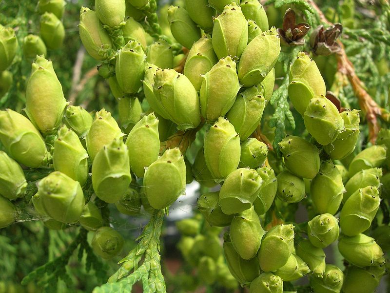 The foliage is composed of small scale-like needles that overlap each other and hug the stem tightly. They are true green to dark green in color. In the winter the foliage may turn a yellow or even an unattractive brown color. Small cones up to 1/2 inch long and composed of overlapping scales form on the limbs. They are egg-shaped and begin greenish color before ripening to a brown. They are normally born in small amounts and not noticeable.