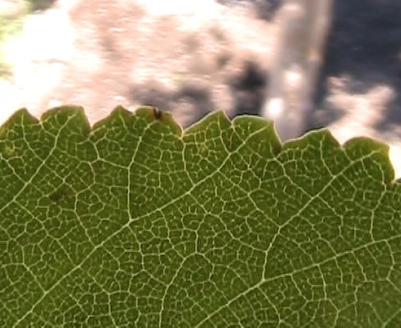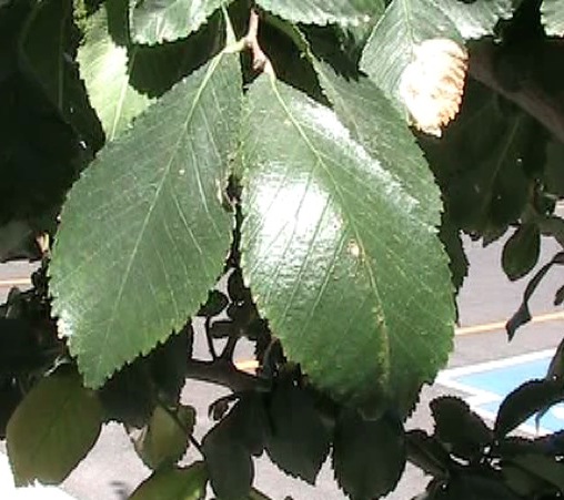| The leaf is obovate and and a dark glossy green. It is has a pinnate venation pattern. | The margin is irregularly serrated. |